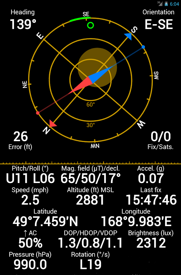 簡介: 開啟後會見到GPS信號強弱,收到的衛星數目及其號碼,亦有估計誤差度參考. 此外,軟件亦包含日出/日落時間,移動速度,本地時間等功能.當然位置及高度資料亦包含在內.
